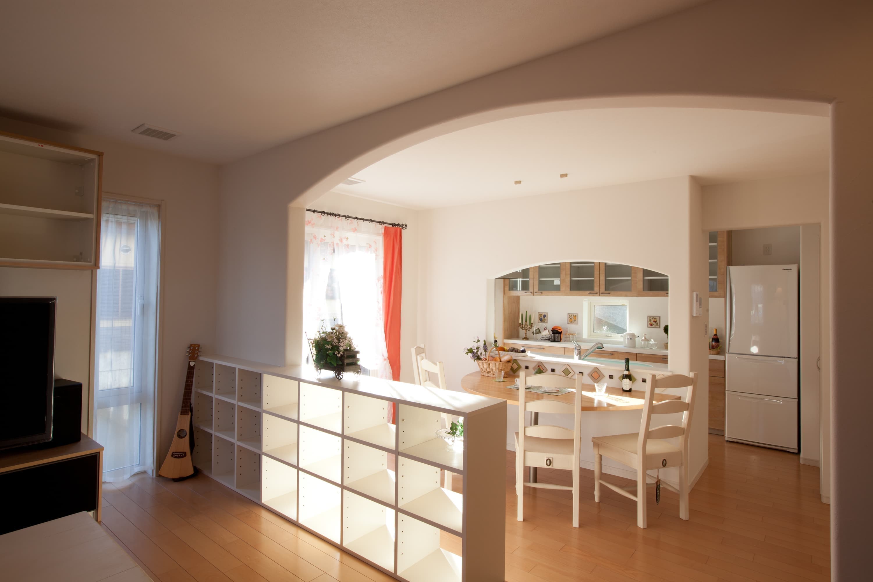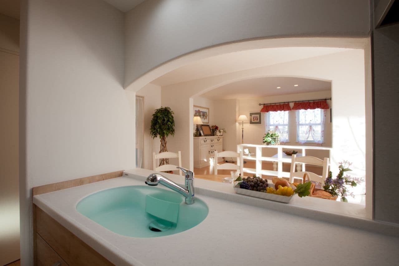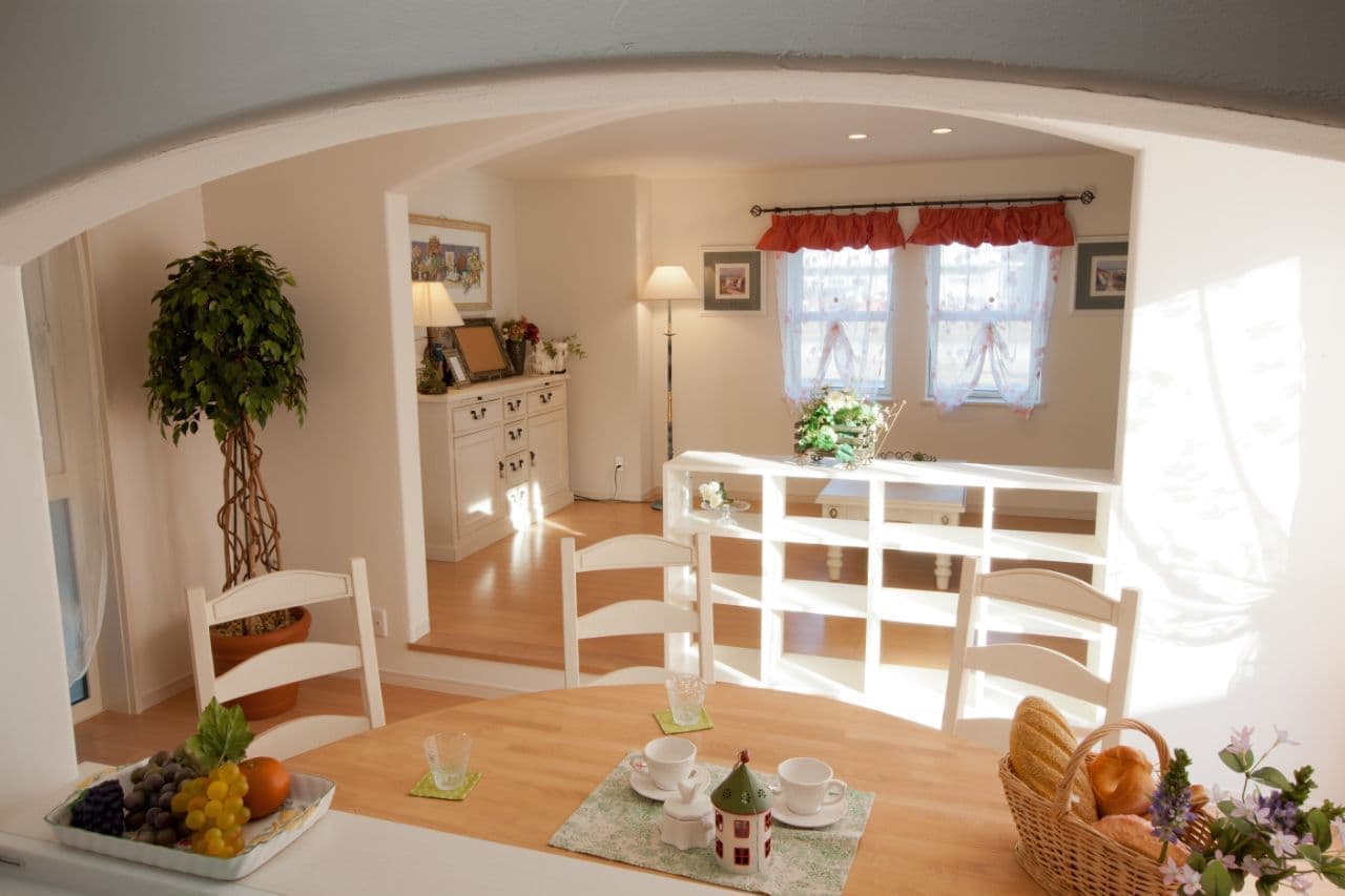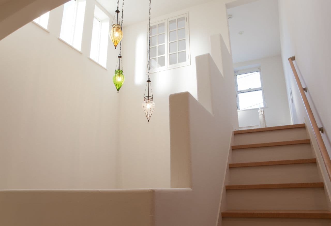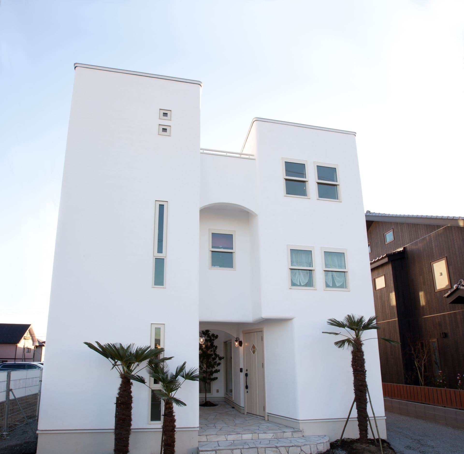 真っ白な漆喰調の塗壁と角を丸く仕上げたミルクのように優しく柔らかな外観の「ミコノス」は、家の中心には光あふれる「パティオ(中庭)」を室内に取り込んだ明るく開放的な住まいです。内部のスキップフロアが1階から屋上まで延びていき、パティオから射す一筋の光でつながる空間演出は、エーゲ海のミコノス島に建つホテルをイメージしたリゾートの光・影・風を感じる事ができます。