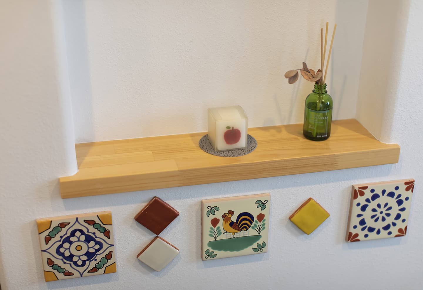 家族用と来客用に分けた2WAY玄関。仕切り壁に設けたニッチで「飾る」を愉しみ、表情豊かに訪れる人を出迎えます。