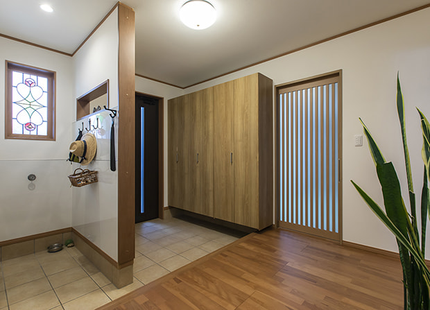 写真の左側、玄関土間の一部は愛犬のためのスペース。家の隅々まで24時間計画換気されるのでペットの匂いも気になりません。