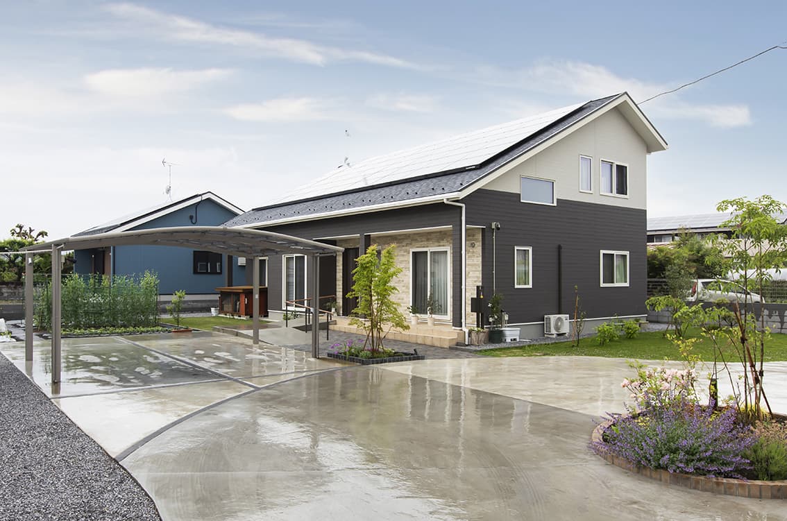 南面を長く伸ばした大屋根が、落ち着いた表情を見せる外観。大容量の太陽光発電を搭載で、売電による家計へのプラス効果は絶大。